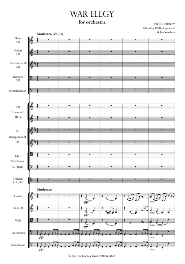 First World War composer and poet Ivor Gurney composed his orchestral elegy in the aftermath of the war, in the autumn of 1920. It was written at the time when the ceremony and architecture of the memorialisation and remembering of those killed in war were being established, with the unveiling of the Cenotaph on Whitehall, the interment of the Unknown Warrior at Westminster Abbey, and the beginning of the annual 11th November Act of Remembrance. Written by a composer who was himself endeavouring to come to terms with his own recent Active Service in the Front Line of France and Flanders, it is a poignant elegy to those lost in the First World War.